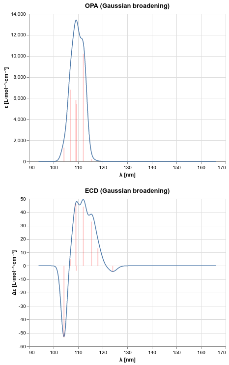 Excitation energies and corresponding spectroscopic observables can be used to produce spectra for one-photon absorption (OPA) and electronic circular dichroism (ECD) with phenomenological line broadening.